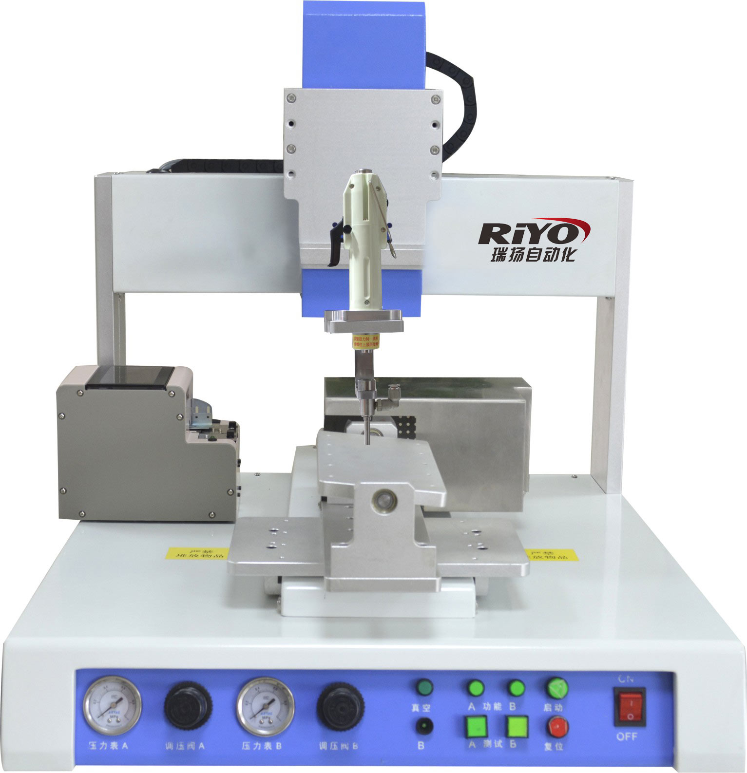 1、吸氣式自動螺絲機(jī)結(jié)構(gòu)相對簡單,制造周期比較短。其主要特點:如果螺絲太小或太短,吹氣式自動螺絲機(jī)就不能實現(xiàn)自動送釘,需要此機(jī)器,機(jī)械手帶動電批吸取螺釘并移動鎖緊(一顆一顆逐點鎖螺釘)。螺絲主要是通過真空發(fā)送生器在電批頭上產(chǎn)生的吸附力,取走單個螺絲,再運行定位到產(chǎn)品孔位上方,電批下降自動將螺釘鎖入孔中。取料效率與移動距離,運行速度有關(guān),一般1.2-1.8秒/顆。